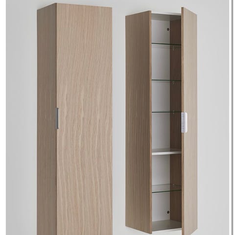 Vägghängt högskåp för badrum märke Dansani. Ett fast hyllplan i trä och fem flyttbara hyllplan i mörkt glas. Alla tillbehör för upphängning ingår. Skåpet är helt nytt och oanvänt. Köpt på Golvpoolen 2025. Ordinarie pris 7590:-. Kvitto finns.