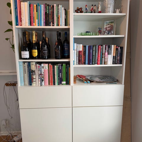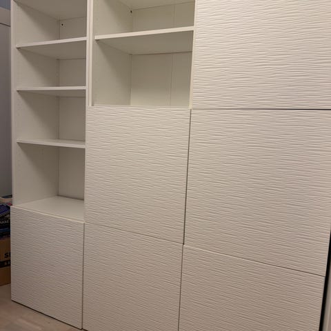 I nedre delen: till vänster ett stort hyllskåp och till höger ett mindre hyllskåp och en låda.