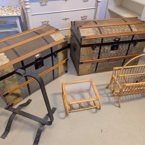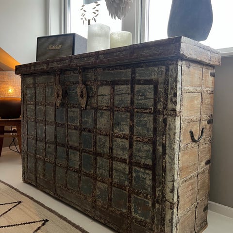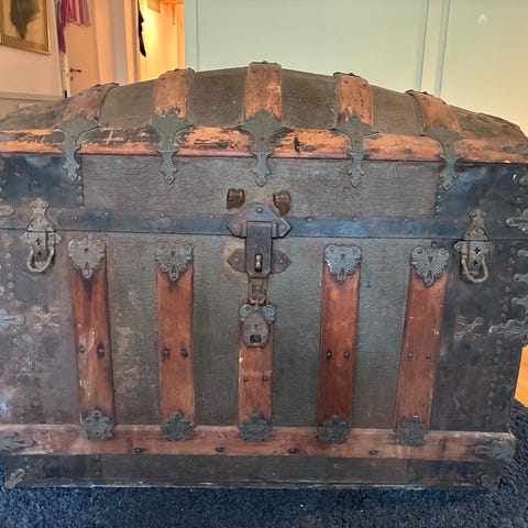 Vacker och gedigen resekista från början av 1900-talet med originalpatina. Etiketter från bland annat Paris, Marseille och Tokyo. Invändigt i mycket fint skick. Ett litet borrat hål på baksidan i lagom storlek för en kabel. Ett av handtagen saknas. Dekorativ inredningsdetalj i vintagestil. Perfekt som soffbord, förvaring eller sängbänk.