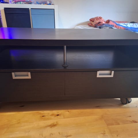 Har tre rymliga lådor och en öppen hylla som passar bra för elektronik, förvaring eller dekoration.