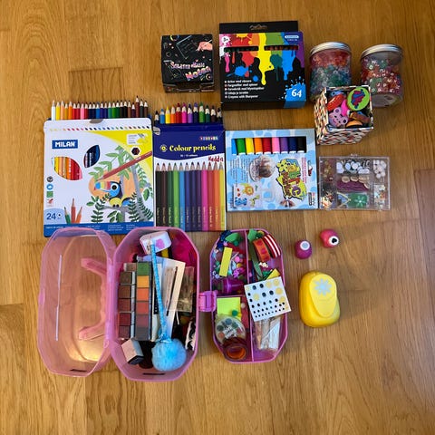 Blandat pyssel: pärlor för pärlplatta samt plattor, pärlor för halsband, paljetter, limpistol och lim, oljefärger, dukar för oljefärg, penslar, papper för origami, instruktionsbok origami, tre apparater för att stämpla mönster, mösntersax och liten sax.