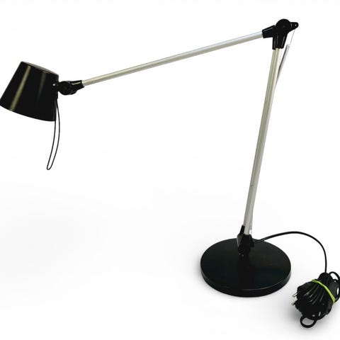 IKEA skrivbordslampa med justerbar arm och svart lampskärm. Lampan har en rund svart bas och är avsedd för skrivbordsbruk. Den är försedd med en sladd och strömbrytare. Maxeffekt 6W. Typ B1603. Lamptyp GU10.
