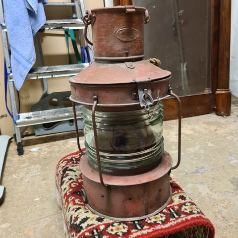 Kraftig konstruktion i plåt med original ribbat Fresnel-/prismaglas. Ursprungligen för fotogen/gas men senare omgjord till el (och nu med helt ny el). Äldre bruksskick med naturlig patina.