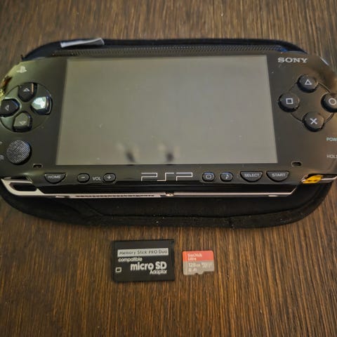 Sony PSP handhållen spelkonsol i svart färg. En bärbar spelenhet med inbyggd skärm och kontroller för spel. Lämplig för spel på språng och underhållning.