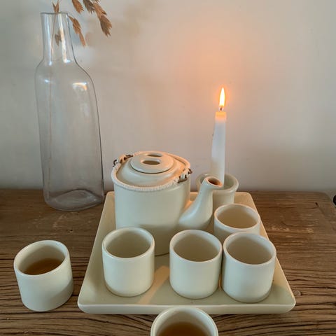 Tekanna och två koppar i stengodsimitation