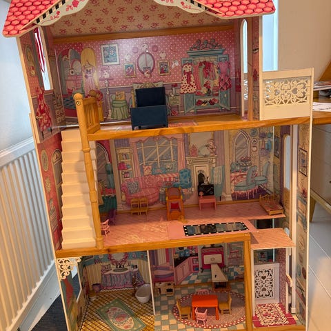 Barbiedockhus med flera rum. Möbler och andra tillbehör inkluderas. Allt i fint skick. Sparsamt använt. Dockhuset har en rosa och vit färg med detaljer i blått och orange. Lämpligt för barn som gillar rollspel och inredning.