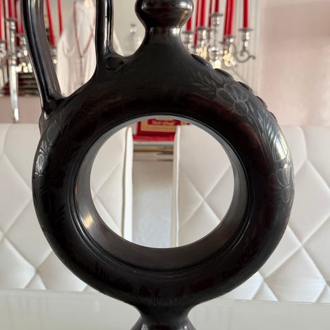 Handmålad keramikvas i grön färg med dekorativa mönster i flera färger. Vasens form är rund med två små handtag på sidorna. Passar som prydnad eller för mindre blomsterarrangemang.