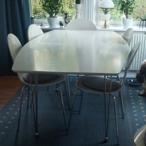 L 220 cm, bredd 100 cm, 1 st iläggsskiva 47 cm. Iläggsskivan förvaras under bordet och syns ej när det inte används.