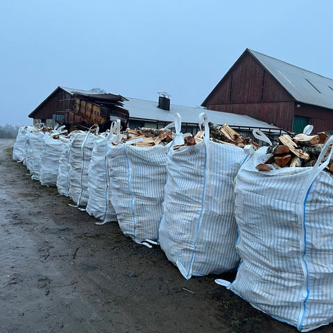Torr björkved kapad och klyvd ca 35 cm säljes i 1 m3 säck