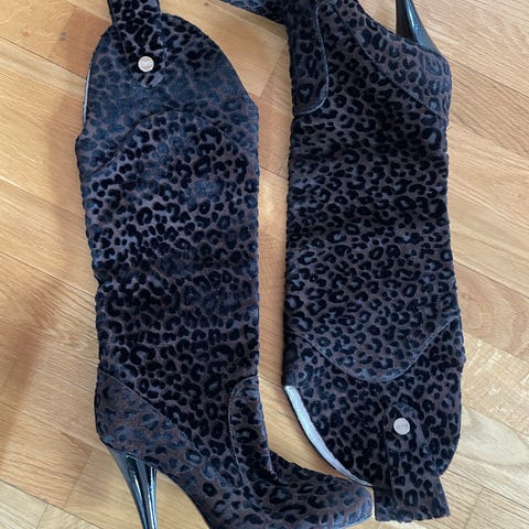 New Rock stövlar i storlek 36. Stövlarna har en unik design med detaljer i guld och leopardmönster. De är höga med smala klackar och har en dragkedja på baksidan för enkel påtagning.