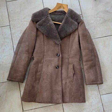 Säljer en varm och tidlös jacka i ljusbrun mocka med ljust fårskinn/fuskpäls på insidan.