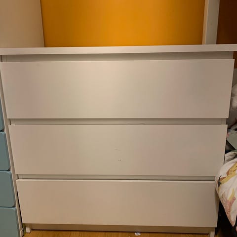 Vit Ikea Malm Byrå med 4 stora lådor och 2 smålådor upptill för praktisk förvaring.
