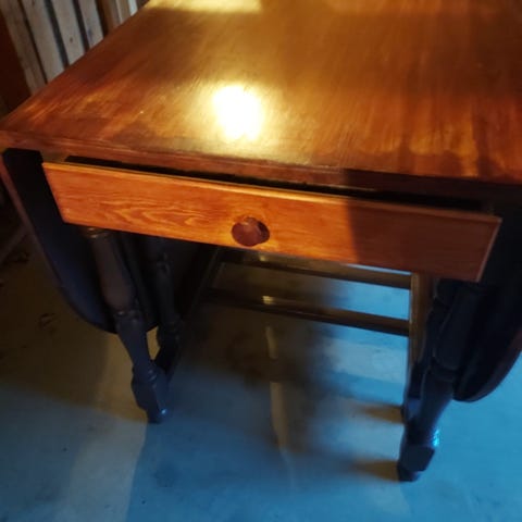 Slagbord/klaffbord i ekfaner. utdraget är längden 210 cm bredd 84. Ihopfällt blir bordet 129 cm långt.