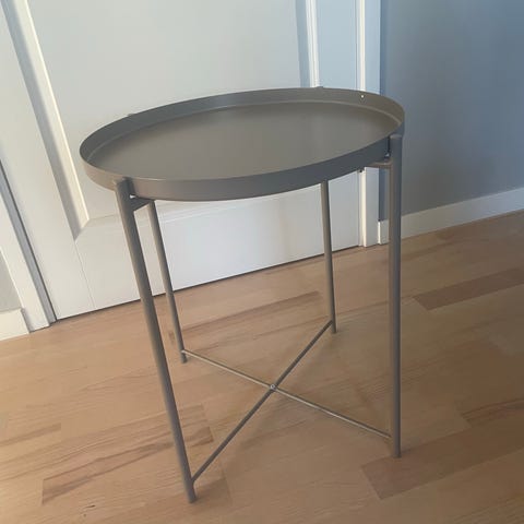 Selling an IKEA GLADOM tray table in black, about 45 cm in diameter and 53 cm high. The tray is removable with raised edges for easy carrying, but it has some scratches as shown in the pictures. The table is stable, easy to move around and made of powder-coated steel that is simple to wipe clean. Pickup only in Gothenburg, first come first served.