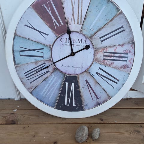 Jättestor väggklocka i vitlackerat järn, Diameter 60 cm. Med romerska siffror. Ring mig på 072-9038336.