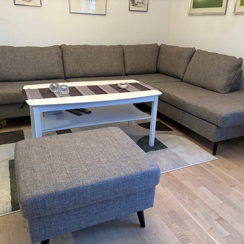 Grå hörnsoffa med soffbord , Fåtölj med fotpall