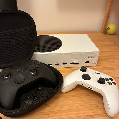 Xbox Series spelkonsol med två svarta handkontroller. Konsolen är kompatibel med Xbox Series-spel och tillbehör.