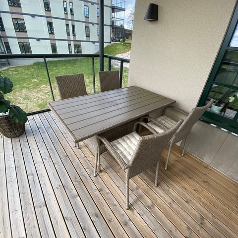 Bord och två stolar. De fungerar utmärkt och är stabila. Fåtalet repor samt lite rost på stolarna (se bilder).