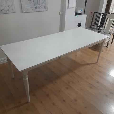 Längd: 2 m, plus 2 st iläggsskivor som är 45cm vardera. Bordet blir 2,90 med iläggsskivor i.