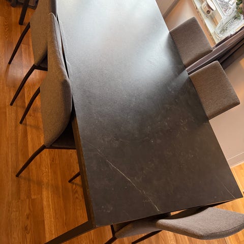 Vitt rund matbord med ett silver bar ben + 4 grå sammet stolar