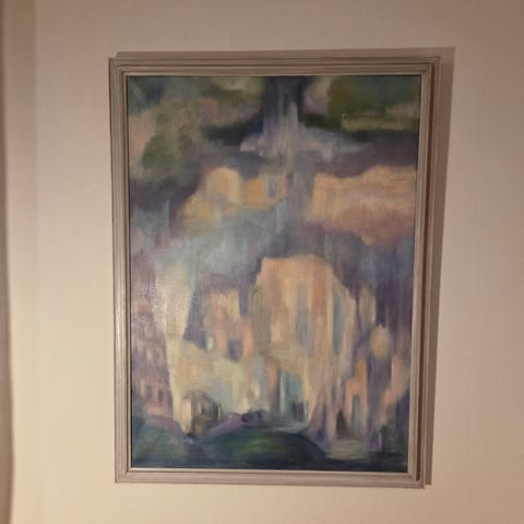 Märta Reuterswärd Slash of Colour oljemålning på duk med ram. Konstverket är signerat och signerad av konstnären. Färgerna är främst röda, gula och gröna i en abstrakt komposition.