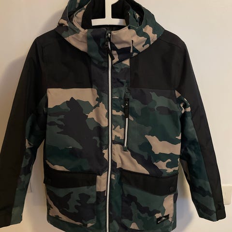 Vinterjacka som har använts vid slalomåkning då jackan har snölås och ficka med dragkedja på vänster arm för skipasskort.