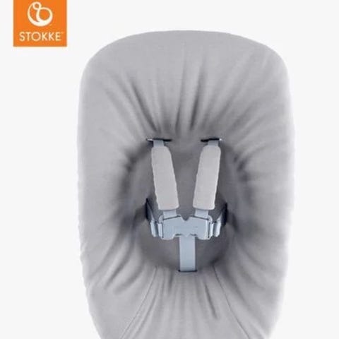 Stokke Newborn med mjukt vadderat sittdyna i grått tyg och säkerhetssele med spänne. Förlängningen av ”stolsfötterna” för att stabilisera stolen och armen till mobilen följer också med.