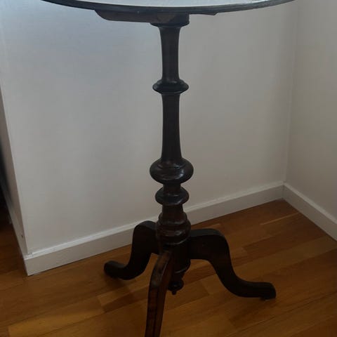Runt träbord med pelarfot och fyra böjda ben. Bordsskiva i trä med naturlig träfärg och synliga ådringar. Passar som matbord eller sidobord i olika rum.