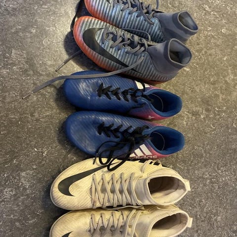Fotbollsskor. Storlek 33,5 (vita) respektive 34 (blåa). OK skick på skorna. 75 kr per par eller 125 för båda två.