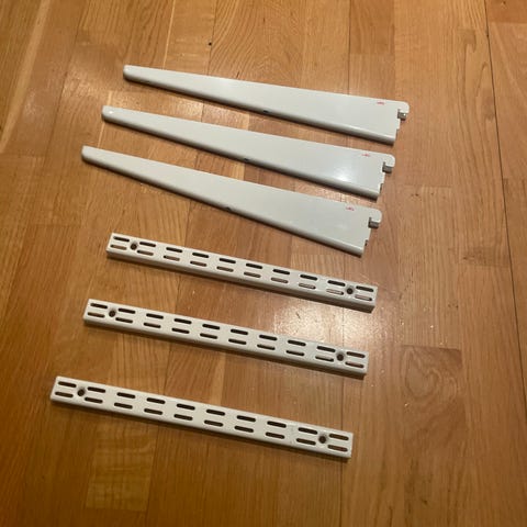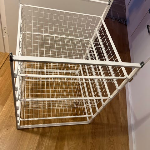 Klassiskt Elfa hyllsystem som kan ställas i en garderob och byggas på höjden.
