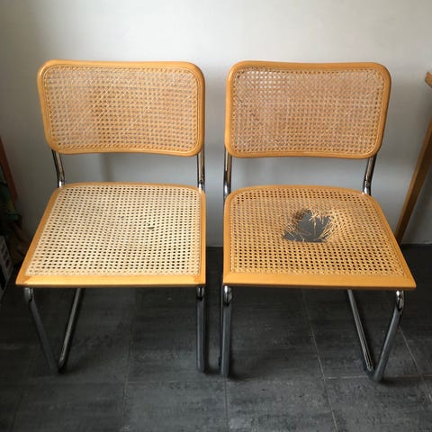 Två stolar i bauhausstil i begagnat skick. Ryggarna som det syns på bilden är sönder. 400 för båda eller bud.