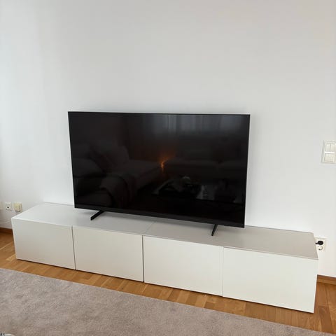 IKEA Bestå med två släta vita luckor och med en IKEA marmorskiva ovanpå som såldes som ett tillbehör. Två hyllplan. Ena hörnan lite skadad nedtill, men går nog att limma ihop lite så det blir snyggare. Några borrade öppningar i bakskivan gör elgenomföring.
