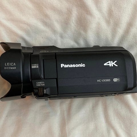 Panasonic HC-VX980 videokamera med 4K-upplösning. Utrustad med Leica-objektiv och 25x optisk zoom. Svart färg och kompakt design. Laddare kabel och batteri. Knappt använd.