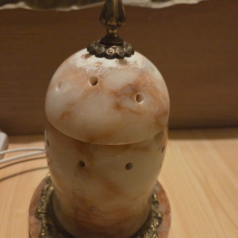 Material: Tillverkad i metall, med en bas som ser ut att vara koppar- eller mässingsfärgad.