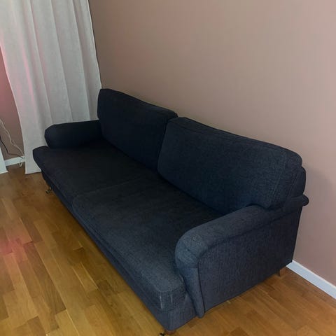 IKEA soffa och fåtölj i rött tyg. Möbelsetet består av en tresitssoffa och en fåtölj med avtagbara klädslar. Tyget på soffan är solblekt i överkant. Passar för vardagsrum eller liknande utrymmen. Hämtas i Mölndal