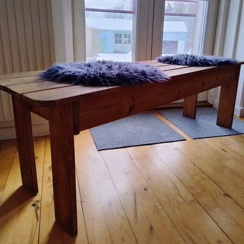 Hallbänk för den som vill slipa och kanske måla. Ytskiktet är slitet efter alla år.
