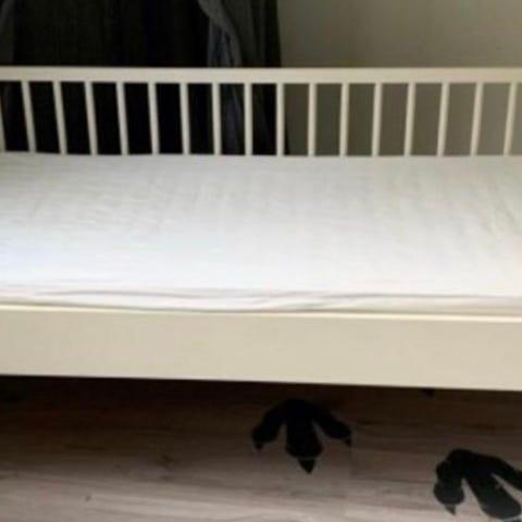 IKEA juniorsäng SUNDVIK i vit trä med madrass och sängkant. Passar för barn och är utformad för att ge en säker sovplats. Längd kan justeras från 130 till 200 cm. Inga fläckar. Hämtas i Mölndal