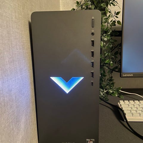 HP Victus stationär dator med AMD Ryzen 5 5500 processor (6 kärnor, upp till 4,2 GHz), 8 GB DDR4 RAM (3200 MHz), 512 GB NVMe M.2 SSD-lagring och Nvidia GeForce RTX 3050 grafikkort med 6 GB minne. Datorn är lämplig för spel och allmänt bruk.