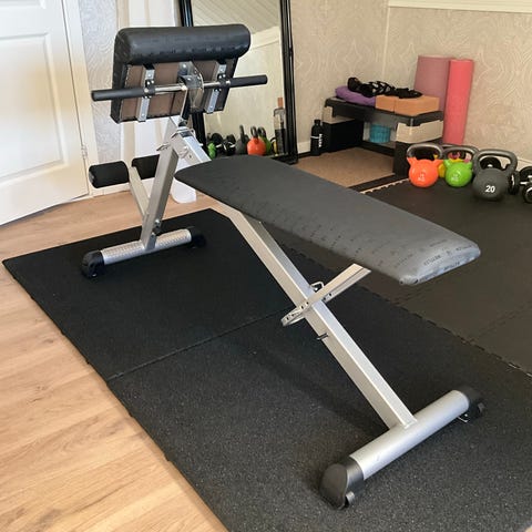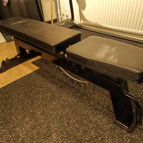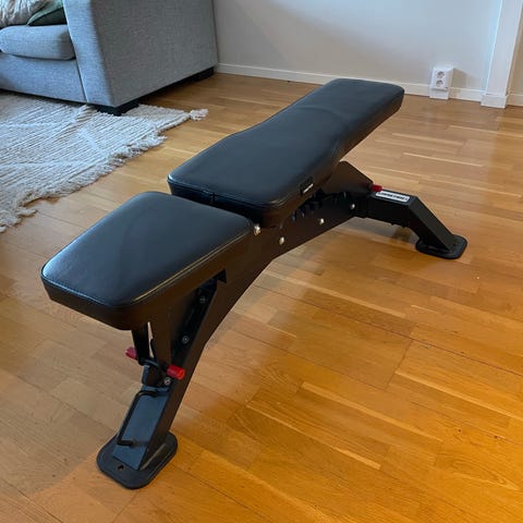 Master träningsbänk justerbar med vadderade stöd för ben och ryggstöd. Bänken kan användas för olika styrketräningsövningar och är anpassad för hemmaträning.