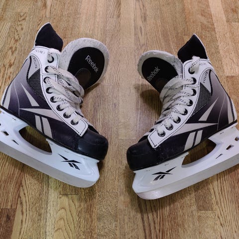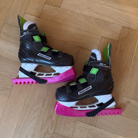 Skridskor i barnstorlek 34 (ca 22cm). Slitet yttertyg på tåpartier, men hela i stommen.