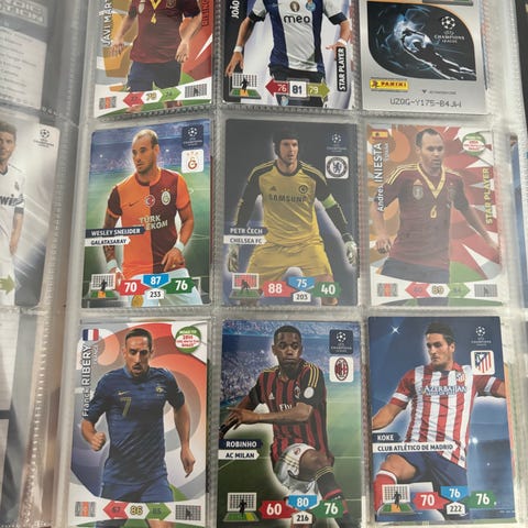 Samling av fotbollskort i ett album. Kort med olika spelare och lag, i varierande design och färger. Kortens storlek och material är standard för samlarkort.