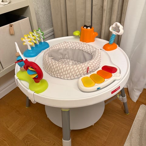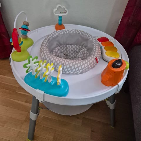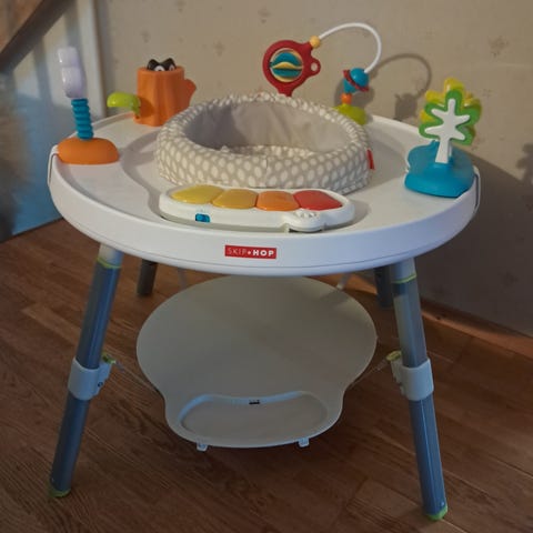 Detta Skip Hop aktivitetscenter är en modern 3-i-1-lösning som låter spädbarn sitta, snurra och studsa försiktigt innan det omvandlas till ett smidigt lekbord för ritning och spel. Detta aktivitetscenter, som har utvecklats med pediatriska experter, har en 360-graders roterande sits med töjbart tyg, ett justerbart fotstöd och löstagbara leksaker som kan placeras var som helst på brickan för att uppmuntra motorisk och sensorisk utveckling. Ett fönster på brickan hjälper barnet att se sina fötter för att främja koordinationen, medan ett musikaliskt piano med ljus, vaggande stjärnor, ett skallrande lamm och en bollbana erbjuder 25 utvecklingsaktiviteter för engagerad lek. Hållbar konstruktion i PP, ABS och stål, avtagbara ben för kompakt förvaring och en sugkoppsskål som tål maskindisk gör detta till ett praktiskt och långvarigt val för hemmabruk.