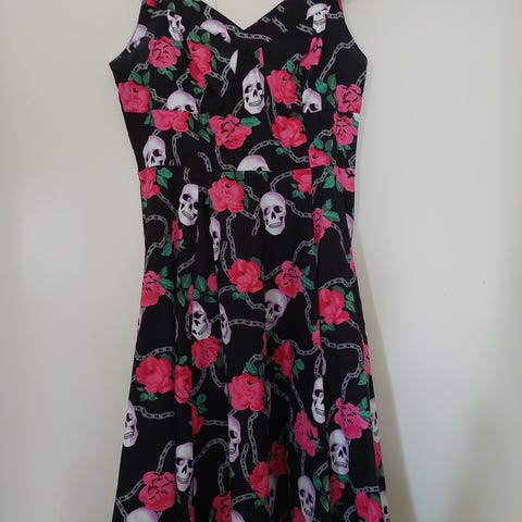 Hell Bunny klänning i storlek M (38) färg rosa, grön, svart, vit. Tillverkad i 98% bomull med 2% spandex. Nyskick och helt utan defekter. Klänningen har ett mönster med gröna enhörningar och olika symboler. Materialet består av 98% bomull och 2% spandex. Tunna axelband medföljer, men går även att ta av. Tvättråd: Tvättas separat.
