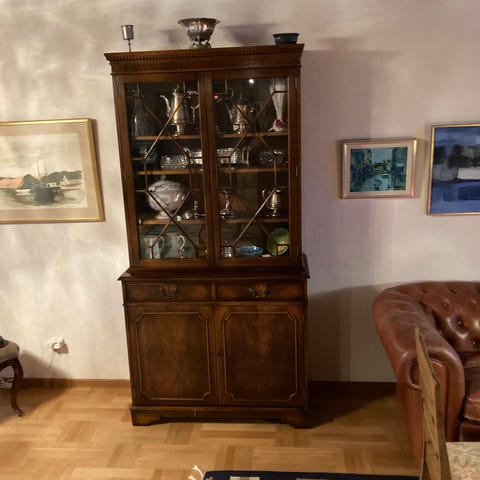 Mycket vackert gustavianskt vitrinskåp med belysning samt spröjsade fönster både på front och sidor. Fint skick, fattas dock en liten grej som ska sitta i ena nyckelhålet (man kan låsa och låsa upp som vanligt ändå) fraktas ej, endast avhämtning, skåpet är delbart. Bvsa