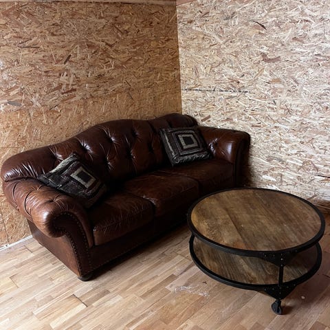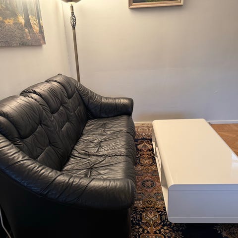 Äkta skinnsoffa, bäddsoffa, bord och stolar, garderob