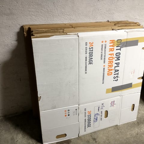 Ca 60 flyttkartonger i olika storlek och olika skick samt en kartong med packpapper