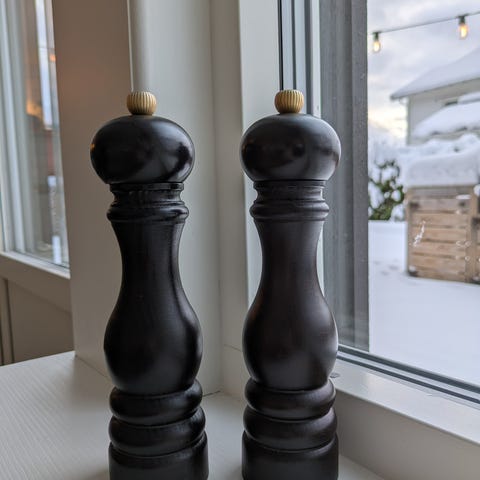18cm. Två stycken kvarnar av riktigt bra kvalitet i mörkbrunt trä.