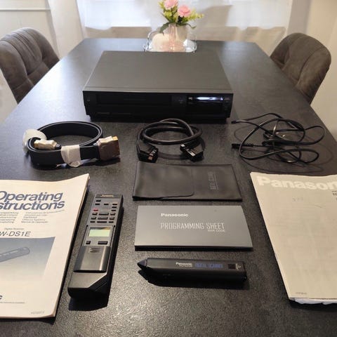 Panasonic Super Drive VHS-spelare med fjärrkontroll. En enhet för uppspelning och inspelning av VHS-band.