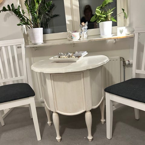 Ett vitmålat furubord med vackra detaljer. Stabilt, rejält och passar utmärkt som avlastningsbord eller liknande.