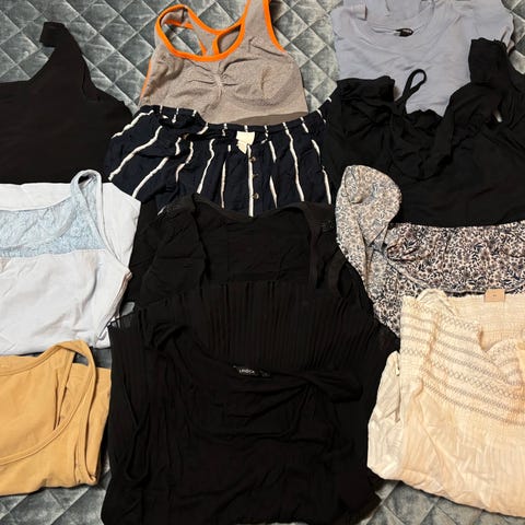 Damkläder i olika modeller och färger stl M. Innehåller toppar, kjolar och byxor i varierande material och storlekar i gott skick. Kläderna är avsedda för kvinnor/tjejer och består av både enfärgade och mönstrade plagg. Sparsamt använda, vissa plagg oanvända.